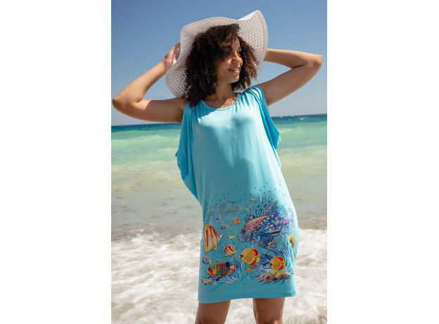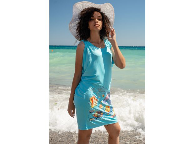 Свободная туника из вискозы. Принт в виде тропических рыбок, длина до середины бедра, рукава отсутствуют