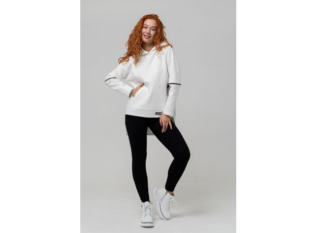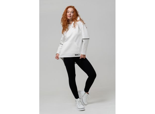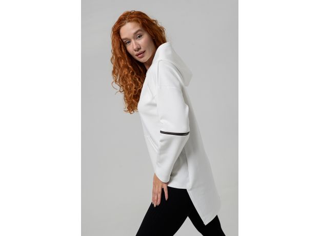 Женская туника выполнена из интерлока. Удлиненная спинка, капюшон. На рукавах в районе локтей выполнены разрезы, которые можно застегнуть на молнию. Имеется карман кенгуру и нашивка внизу толстовки.