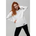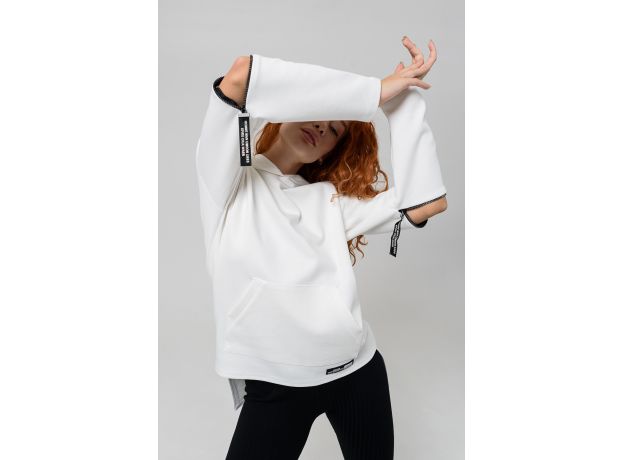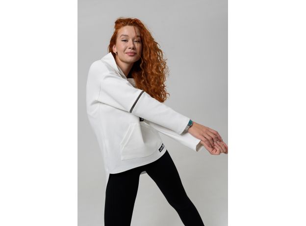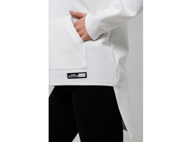 Женская туника выполнена из интерлока. Удлиненная спинка, капюшон. На рукавах в районе локтей выполнены разрезы, которые можно застегнуть на молнию. Имеется карман кенгуру и нашивка внизу толстовки.