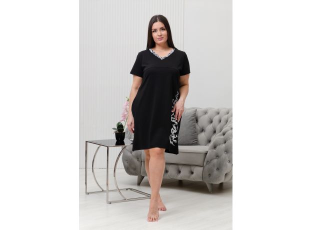Туника полуприлегающего силуэта, с боковыми карманами, средней длины, с V-образной горловиной. Рукав втачной, короткий. На полочке расположена кокетка. В нижней части боковых швов обработаны разрезы. Горловина обработана обтачкой из отделочного полотна.